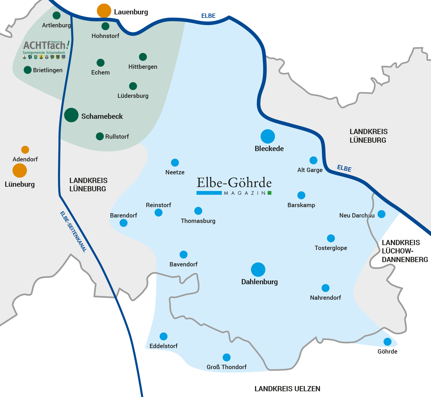 Das „Elbe-Göhrde MAGAZIN“ wird in folgenden Orten im Landkreis Lüneburg 5x im Jahr (März / Mai / August / Oktober / Dezember) kostenlos an alle Haushalte (außer Werbeverweigerer) mit der Deutschen Post AG als „POSTAKTUELL“ verteilt: 19273 Bleckede (Neu Bleckede, Neu Wendischthun)21354 Bleckede (Alt Garge, Barskamp, Bleckede, Bleckeder Moor, Brackede, Breetze, Garlstorf, Garze, Göddingen, Karze, Nindorf, Radegast, Reeßeln, Rosenthal, Vogelsang, Walmsburg, Wendewisch)21368 Boitze (Ahndorf, Boitze, Fladen, Gut Horn, Neetzendorf, Seedorf, Vindorf)21368 Dahlem (Dahlem, Harmstorf, Köstorf, Marienau)21368 Dahlenburg (Bargmoor, Becklingen, Buendorf, Dahlenburg, Dumstorf, Eimstorf, Ellringen, Gienau, Groß Sommerbeck, Klein Sommerbeck, Leestahl, Lemgrabe, Quickborn, Riecklingen, Siecke21369 Nahrendorf (Breese, Eichdorf, Kovahl, Lüben, Moislingen, Mücklingen, Nahrendorf, Neestahl, Nieperfitz, Nüdlitz, Oldendorf an der Göhrde, Pommoißel, Röthen, Süschendorf, Tangsehl)21371 Tosterglope (Horndorf, Köhlingen, Tosterglope, Ventschau)21397 Barendorf 21397 Vastorf 21398 Neetze (Neetze, Süttorf, Neu Neetze, Neu Süttorf) 21400 Reinstorf (Reinstorf, Holzen, Horndorf, Sülbeck, Wendhausen21401 Thomasburg (Bavendorf, Radenbeck, Thomasburg, Wennekath, Wiecheln29473 Göhrde (LK Lüchow-Dannenberg)29490 Neu Darchau (LK Lüchow-Dannenberg – Drethem, Katemin, Klein Kühren, Neu Darchau, Sammatz, Schutschur)29575 Altenmedingen (Aljarn, Bohndorf, Bostelwiebeck, Eddelstorf, Haaßel29584 Himbergen (Groß Thondorf)